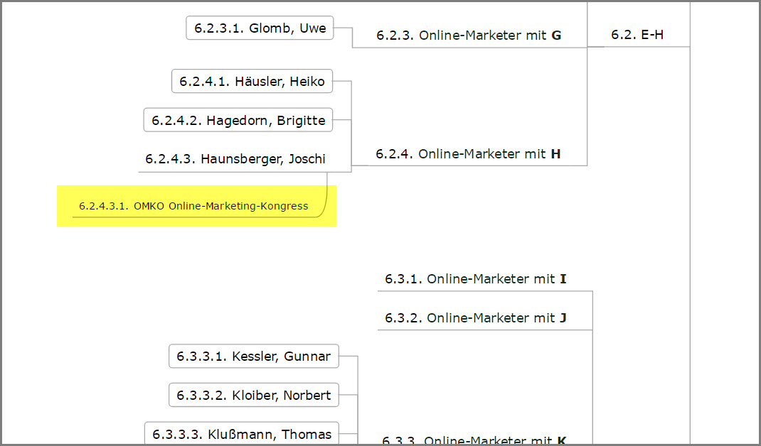 Beispiel. In unserer Online-Marketing-Mindmap befindet sich dieser Eintrag : 5.1.23. OMKO Online-Marketing-Kongress
